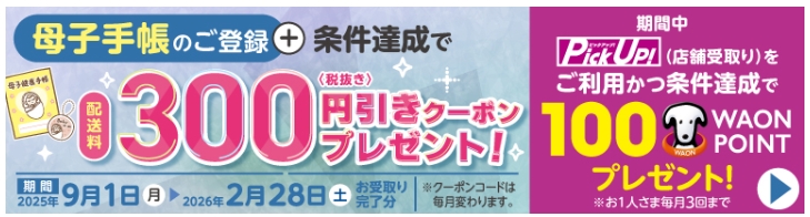 現在、イオンネットスーパーでは、母子手帳の登録で配送料300円分のクーポンがもらえるキャンペーンが実施されています。