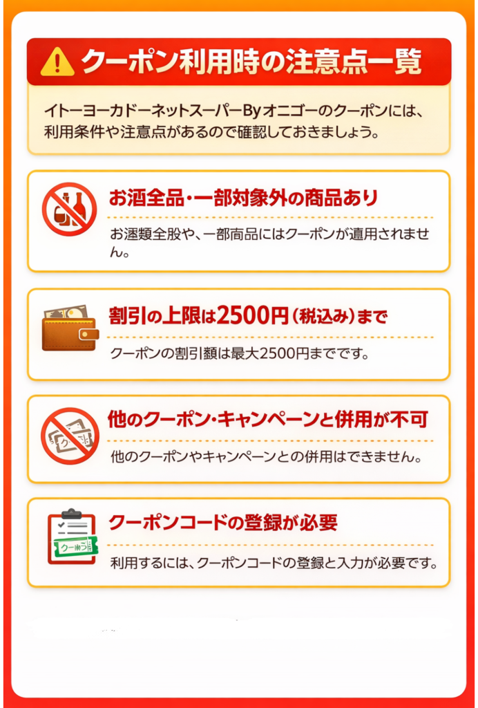 イトーヨーカドーネットスーパーbyオニゴーのクーポンには、一部除外品があるなどクーポン利用のルールがあります。
