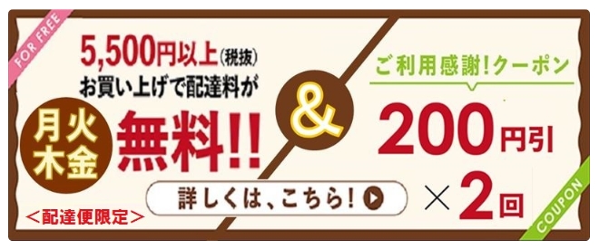 | 利用条件 | 酒類・配達料金を除く3,500円(税込)以上 の購入で利用可能 |