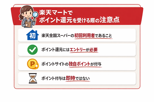 ポイントサイト経由で楽天マートを利用する際のポイントは、以下のとおりです。