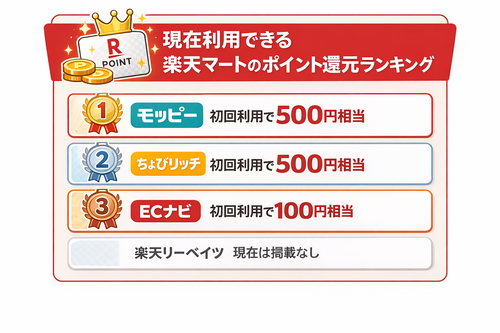 ここでは、現在楽天マートで利用できる主なポイント還元を一覧で紹介します。