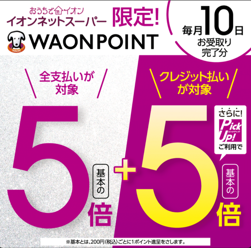 イオンネットスーパーでは、毎月5日商品受取分の注文を、WAONポイントで支払うと10%の還元を受けられるキャンペーンが実施されています。