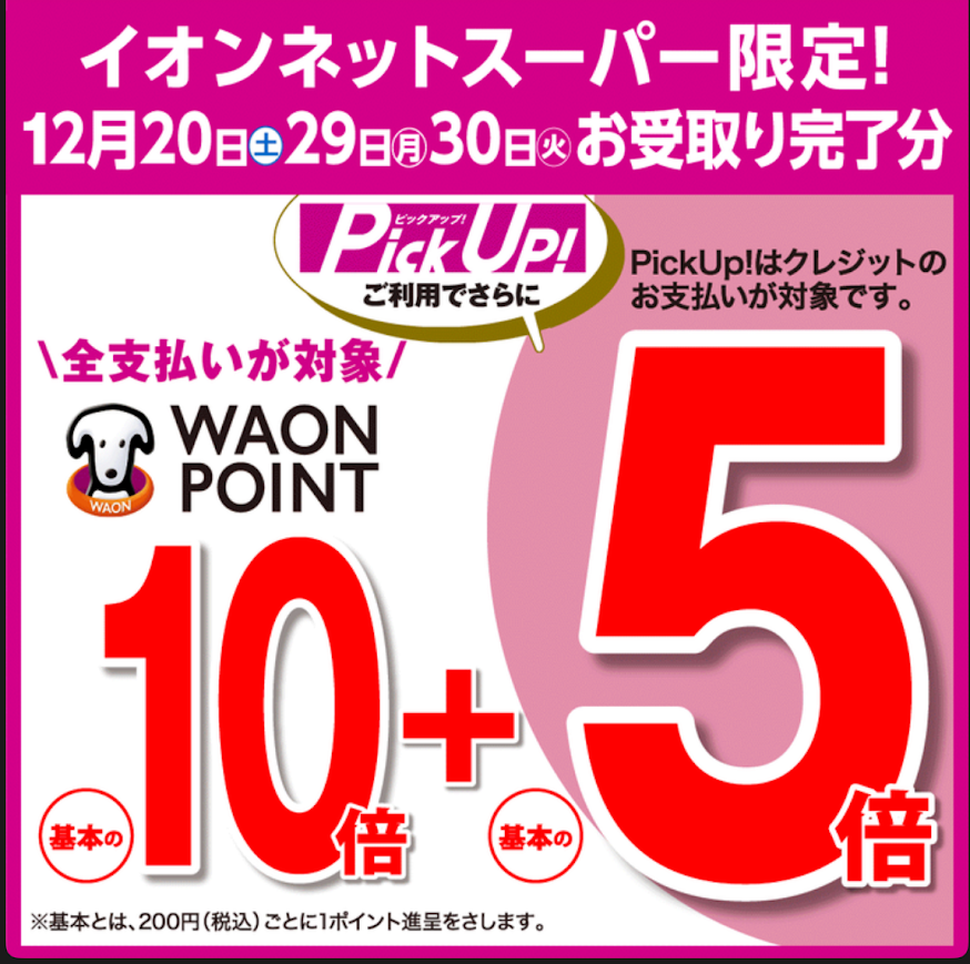 イオンネットスーパーでは、店頭受取(PickUp)でポイント基本の5倍なのポイントアップデーが定期的に開催されています。